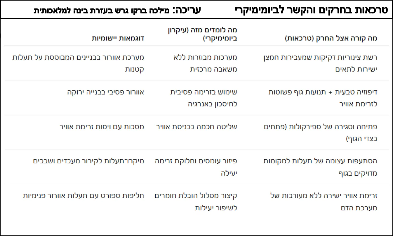 זה מאפשר: פיזור עומסים, קירור מהיר, התאמה גם לאזורים קטנים מאוד. בביומימיקרי: מיקרו-צינורות לקירור שבבים, חליפות ספורט עם תעלות אוויר מהונדסות, מערכות אוורור חדשות לבתי חולים/ מעבדות.