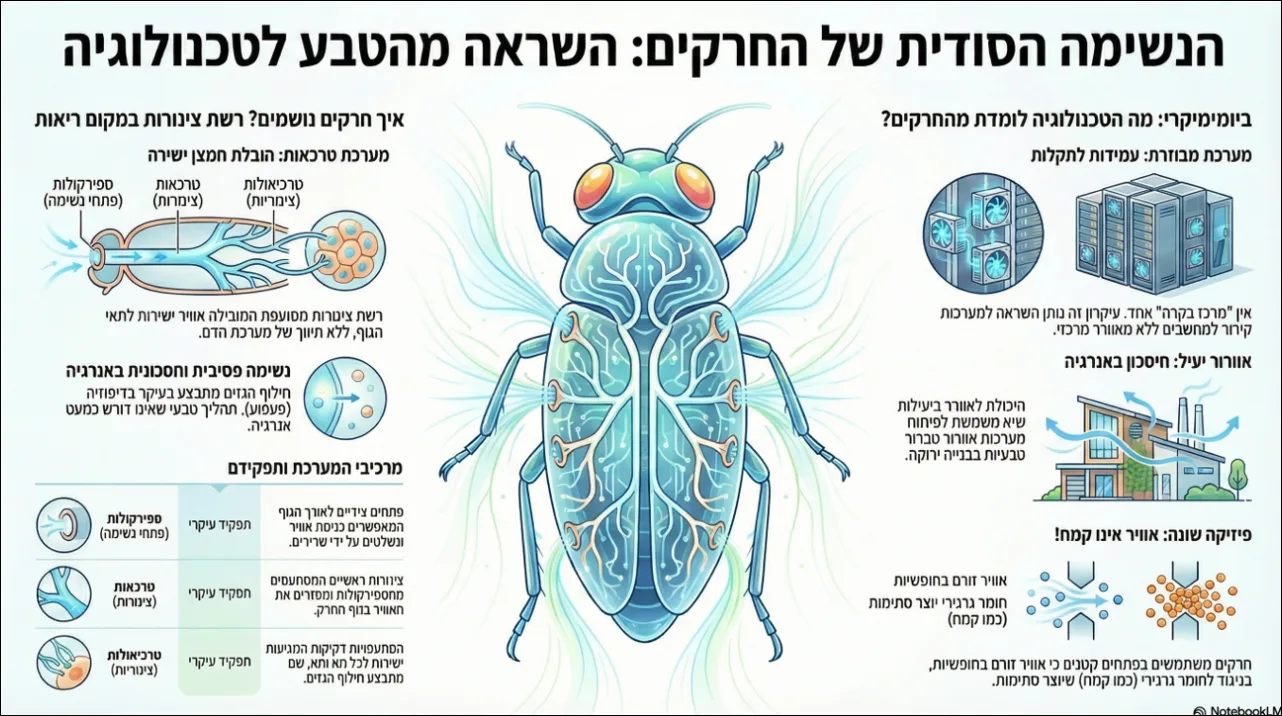 נשימת חרקים כמעט לא צורכת אנרגיה- האוויר נע לפי דיפוזיה, ולפעמים שינויי לחץ פשוטים. בביומימיקר זה רלוונטי לפיתוח: מבנים שמתחלף בהם האוויר באופן טבעי בלי מזגן, מערכות אוורור "פסיביות"