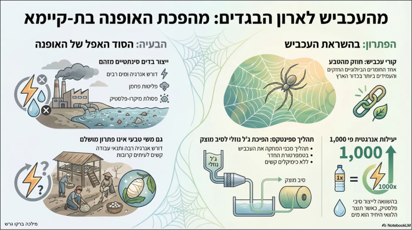 הפעילות מתמקדת בנזקים הסביבתיים הכבדים של תעשיית האופנה המודרנית, המסתמכת על תהליכים בזבזניים וכימיקלים מזיקים לייצור בדים. כפתרון לבעיה, חברת "Spintex" פיתחה טכנולוגיה פורצת דרך המבוססת על ביומימיקרי, השואבת השראה מהדרך שבה עכבישים טווים קורי משי. בניגוד לשיטות תעשייתיות, המערכת הופכת ג'ל חלבוני לסיב מוצק בטמפרטורת החדר באמצעות לחץ פיזי בלבד וללא צורך בחום קיצוני. תהליך זה יעיל פי אלף מצריכת האנרגיה של ייצור פלסטיק, כשהתוצר היחיד שנפלט הוא מים נקיים. בזכות חיקוי מנגנון הטוויה הטבעי, החברה מציעה תחליף בר-קיימא ואיכותי שעשוי לחולל מהפכה בעתיד עולם הטקסטיל.