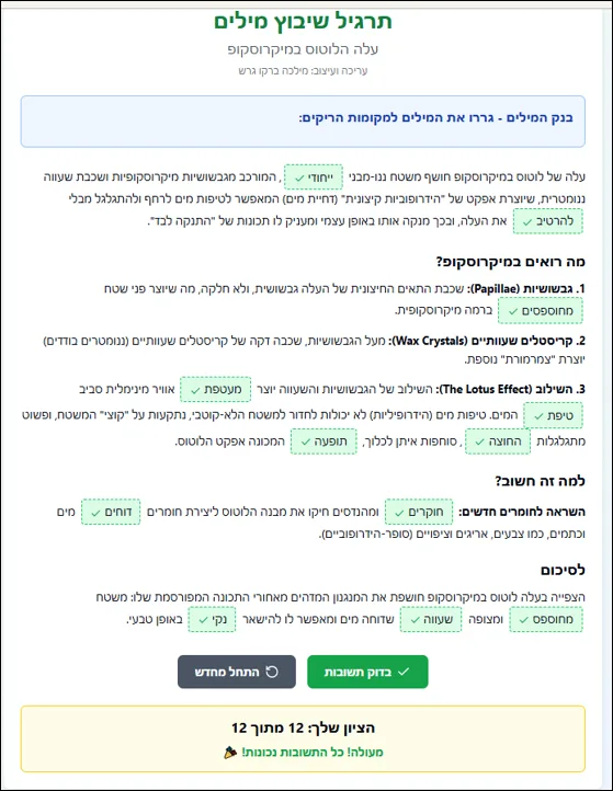 התלמידים יוכלו להתנסות בעצמם בהרחקת טיפות המים מהעלים,