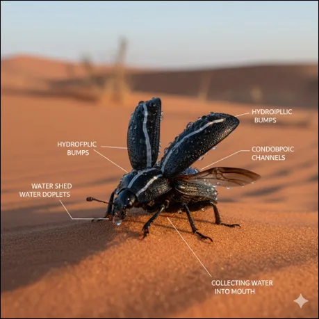 לפנות בוקר, כשגופה עוד קר מהלילה, אבל הסביבה מתחילה להתחמם, היא פורשת את כנפיה, מרימה את רגליה האחוריות, ואז הפלא מתרחש: על כנפיה יש גבשושיות הידרופיליות (מושכות מים) קטנות, וטיפות המים מתחילות להתעבות עליהן. הטיפות מתגבשות ונופלות לחריצים שבין הגבשושיות. החריצים לעומת זאת הידרופוביים (דוחי מים). הטיפות נדחות מהחריצים ומחליקות בשיפוע שנוצר כתוצאה מהרמת הרגליים האחוריות היישר לתוך פיה. כך בפשטות היא שותה מים מהאוויר.