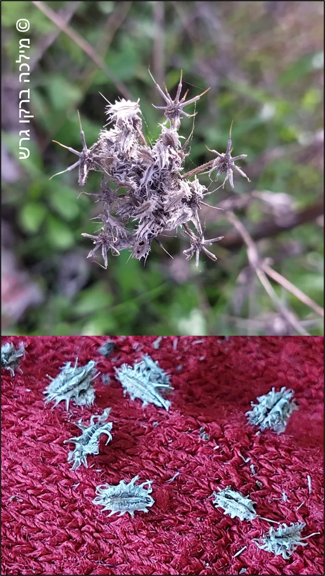 של צמח בשם לָפָה קוצנית נדבקו לפרוות הכלב ולמכנסיו. מדובר במנגנון