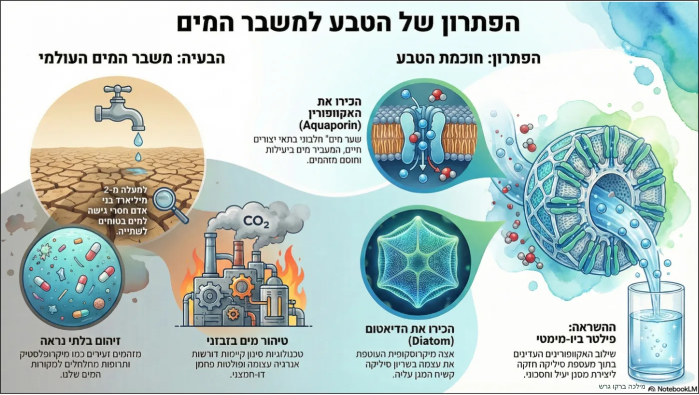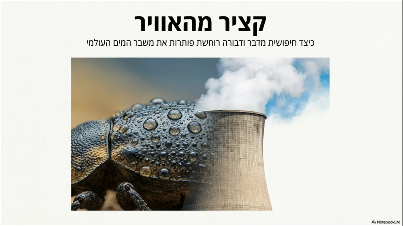 פתרון טכנולוגי חדשני לבעיית המחסור העולמי במים, הנובע במידה רבה מצריכה מסיבית של תחנות כוח לצורכי קירור. בהשראת חיפושית מדבר הנמיב, המנקזת טל מגופה, ובהתבסס על משיכה אלקטרוסטטית המזכירה איסוף אבקה על ידי דבורים, פיתחו מדענים מערכת ללכידת אדים. הטכנולוגיה משתמשת בפולט יונים כדי לטעון חשמלית את טיפות המים הנפלטות ממגדלי הקירור, ובכך גורמת להן להיצמד לרשת מתכתית. המים שנאספים מוחזרים לשימוש חוזר במערכת, מה שיוצר מעגל מים סגור ויעיל יותר. גישה זו של ביומימיקרי עשויה להפחית משמעותית את בזבוז המים בתעשייה ולהבטיח משאבים חיוניים לאזורים צמאים ברחבי העולם.