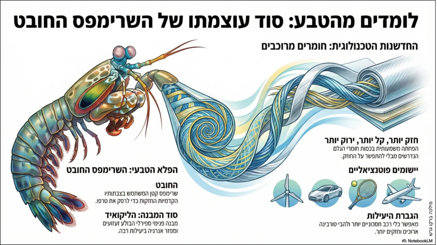 החסילון המנטיסי, המכונה "המרסק", מהווה השראה לפיתוח חומרים מרוכבים מתקדמים בזכות מבנה גופו הייחודי. מדענים גילו כי הזרועות העצמתיות שלו בנויות במבנה ספירלי המכונה "הליקויד", אשר מסוגל לספוג זעזועים אדירים ולפזר אנרגיה ביעילות. חברת "הליקויד תעשיות" משחזרת את הארכיטקטורה הטבעית הזו כדי לייצר מוצרים קלים וחזקים יותר המפחיתים את צריכת חומרי הגלם. יישום הטכנולוגיה בתחומי התעופה, הרכב והאנרגיה צפוי לשפר את היעילות האנרגטית ולצמצם את הפגיעה בסביבה. בסופו של דבר, המנגנון הביולוגי של היצור הימי הקטן מאפשר פריצת דרך הנדסית בייצור רכיבים עמידים וברי-קיימא.